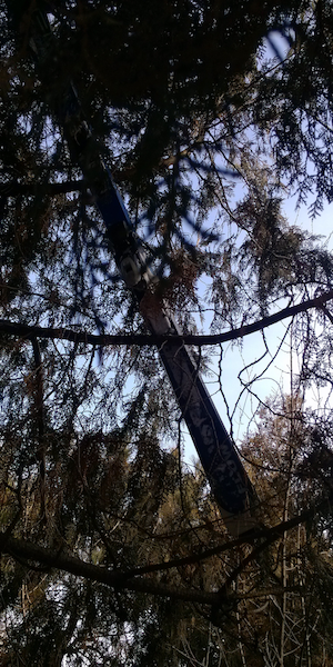 我在坐中级道的缆车上,有很多次在下缆车时摔倒了,还有一次很惨地把滑雪板落在途中的树上。